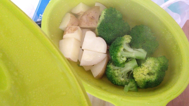 いまではブロッコリー、じゃがいも、にんじんなど、多くの野菜を「チン」で完結させています。